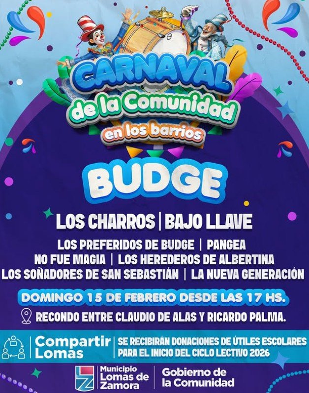 El domingo 15 de febrero, desde las 17 horas, será el turno del barrio de Ingeniero Budge, donde todo el ritmo y el color invadirán la calle Recondo entre Claudio de Alas y Ricardo Palma. La celebración contará con las presentaciones estelares de Los Charros y Bajo Llave, además de las actuaciones de la murga Los Preferidos de Budge, No fue Magia, Pangea, Los Herederos de Albertina, Los Soñadores de San Sebastián y la Nueva Generación.
