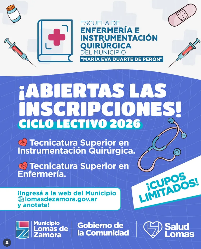 El Municipio de Lomas informa que se encuentran abiertas las inscripciones para las carreras de la Escuela de Enfermería e Instrumentación Quirúrgica. La formación cuenta conn títulos oficiales, y el período de inscripción online estará vigente durante todo el mes de octubre.
